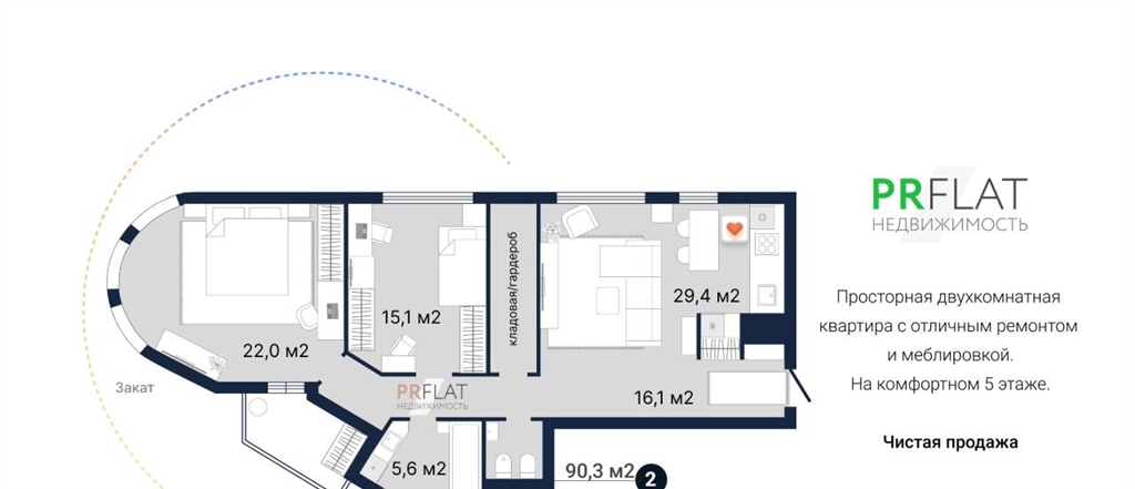 эксклюзивное предложение, звоните в чистой продаже просторная, светлая квартира с отличным ремонтом в жк монтекристо по адресу ул. фурманова, дом 124 мкрн югозападный.квартира общей площадью 90,3 кв. м большая кухнягостиная 29 кв. м, детская 15 кв. м, уютная спальня 22 кв. м с выходом на балкон, функциональный коридор с прихожей 16 кв. м, два санузла, гардеробная. окна на три стороны юг, запад и север. расположена квартира на комфортном 5 этаже из 22.квартира с качественным ремонтом и меблировкой. после покупки можно сразу заезжать.расходы на обслуживание комфортные коммунальные платежи, так как установлены счетчики на электричество, воду и отопление. жк монтекристо сдан в 2016 году. в доме чистый аккуратный подъезд, грузопассажирские лифты. на территории детская площадка и места для отдыха.микрорайон югозападный имеет богатую развитую социальную и общественную инфраструктуру рядом школы, несколько детских садов, супермаркеты, салоны красоты, кафе, рестораны, а также трц фан фан. парки зеленая роща и им. 50летия влксм в шаговой доступности. рядом остановки общественного транспорта легко и быстро добираться до любой точки города. оформление чистая продажа, один взрослый собственник, квартира без обременений, быстрый выход на сделку, продается по договору куплипродажи.покупка данной квартиры от рr flат недвижимость даёт ряд преимуществ одобрение ипотеки под этот объект оперативно и бесплатно электронная регистрация сделки в офисе агентства комфортное сопровождение сделки рr flат недвижимость надежный партнер уральской палаты недвижимости. если вы владелец недвижимости обращайтесь к нам, также достойно представим, прорекламируем и выгодно продадим ваш объектколлеги риэлторы и другие пользователи циан, просьба не копировать авторское описание объекта, а также фото и планировку. материалы созданы нашей компанией и согласно закону авторское право в сети интернет защищает любые виды контента тексты, изображения, фото, дизайн, графику.комментарий представителя. меня зовут наталия сидорова риэлтор компании pr flat. я отвечаю за продажу этого объекта. свяжитесь со мной, чтобы получить расширенную консультацию о квартире, способах покупки или договориться о просмотре, звоните