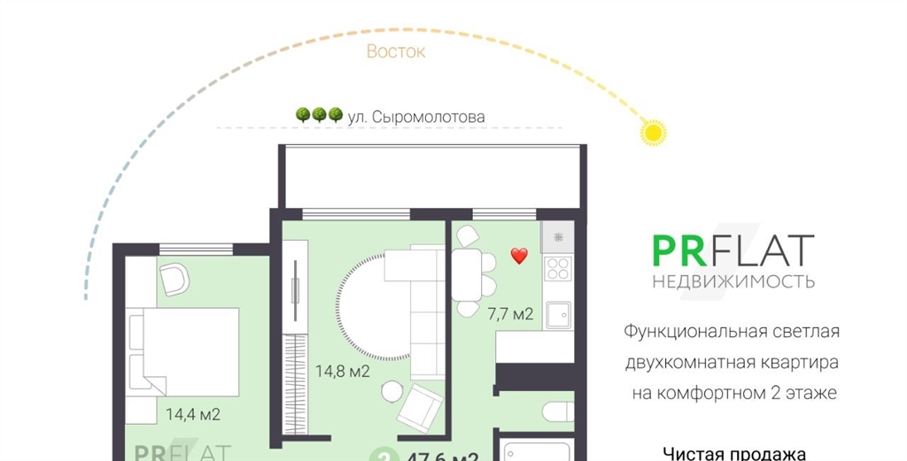 отличное предложение, звоните в продаже функциональная двухкомнатная квартира по адресу ул. высоцкого, дом 10 жби.квартира общей площадью 47,6 м2 просторная гостиная 14,8 м2 с выходом на лоджию, спальня 14,4 м2, функциональный коридор 7,1 м2, кухня с выходом на лоджию 7,7 м2, раздельный санузел.квартира расположена на комфотном 2 этаже. окна выходят на восточную сторону.9этажный дом по адресу высоцкого, 10 расположен в кировском районе, микрорайон жби. прямо у дома несколько детских садов 389, 102, родники, гимназия 45 и школа 157, в шаговой доступности супермаркеты, салоны, мед.учреждения, кафе, аптеки, пункты выдачи заказов маркетплейсов и многое другое. через дорогу благоустроенный парк каменные палатки с озером шарташ. до центра екатеринбурга 25 минут.оформление чистая продажа, один взрослый собственник, квартира без обременений. быстрый выход на сделку, продается по договору куплипродажи дкп, возможна ипотека на вторичку любого банка, предоставим скидку 0,3 по ипотеке сбера.с удовольствием рассмотрим покупателя со 100 оплатой или ипотекой любого банка с первоначальным взносом.покупка данной квартиры от рr flат недвижимость даёт ряд преимуществ одобрение ипотеки под этот объект оперативно и бесплатно электронная регистрация сделки в офисе агентства комфортное сопровождение сделки рr flат недвижимость надежный партнер уральской палаты недвижимости.если вы владелец недвижимости обращайтесь к нам, также достойно представим, прорекламируем и выгодно продадим ваш объектколлеги риэлторы и другие пользователи циан, просьба не копировать авторское описание объекта, а также фото и планировку. материалы созданы нашей компанией и согласно закону авторское право в сети интернет защищает любые виды контента тексты, изображения, фото, дизайн, графику.комментарий представителя.меня зовут ольга тюнина риэлтор компании pr flat. я отвечаю за продажу этого объекта. свяжитесь со мной, чтобы получить расширенную консультацию о данной квартире, способах покупки или договориться о просмотре, звоните
