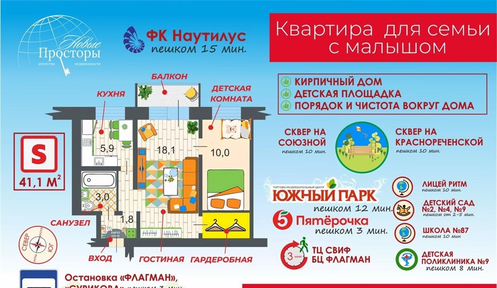 квартира для семьи с малышомкраснореченская 95это не просто историческая часть индустриального района, это очень удобное место и вот почемупо соседству два сквера много зелени, можно гулятьрядом с администрацией и судом порядок и чистотасамое узкое место между п.морозова и краснореченской, а это значит, что до ост.сурикова 2 минуты пешком, а до ост администрация инд.рна 3 минуты пешкомтаким образом удобная транспортная доступность автобусов 10, 25, 30, 89, 73, 71, 107пятерочка, тц свиф, бц флагман 3 минуты пешком детские сады 2, 4, 9 от 2 до 5 минут пешкомдетская поликлиника 9 8 минут пешкомдо школы 87 10 минут пешком до лицея ритм 12 минут пешкомюжный парк и наутилус 15 минут пешкомквартира хорошо подойдет для проживания и для сдачи в аренду. ключи сразу после сделки. вся сумма в договоре. сделка нотариальная, поэтому максимально безопаснаякомиссия агентства 50 000 руб.