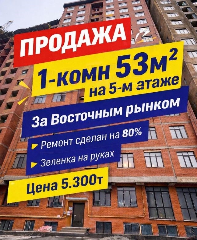 горящее предложение квартира, где не ты за ремонт, а ремонт за тобой. 1комнатная квартира, 53 м², район восточного рынка ирчи.квартира с ремонтом на 80 отопление проведено санузел полностью в кафеле осталось ламинат, потолок побелить и стены на свое усмотрение красить или обклеить обои.отличная возможность завершить ремонт под себя и не переплачивать за чужой дизайн.дом уже заселён 2030, благоустроенный двор. район с развитой инфраструктурой рядом рынок, магазины, транспорт. зелёнка на руках цена 5.3 млн срочная продажа отличный вариант как для себя, так и для инвестиций.