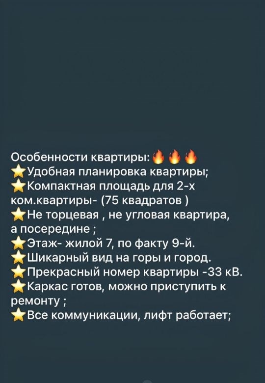 продается просторная квартира с отличной планировкой в современном 15этажном доме. общая площадь квартиры составляет 75 кв. м, из которых 53 кв. м жилая площадь, а кухня занимает целых 20 кв. м. квартира расположена на 9 этаже, с высотой потолков 3.2 метра, что создает ощущение простора и света. из окон открывается вид на улицу, а в квартире есть одна лоджия и один балкон.квартира без ремонта, что дает вам возможность создать интерьер по своему вкусу и воплотить все дизайнерские мечты. в квартире предусмотрен один отдельный санузел. высокие потолки и просторная кухня позволяют создать комфортное пространство для жизни и отдыха.дом оснащен одним пассажирским и одним грузовым лифтом, что делает переезд и транспортировку вещей более удобными. для владельцев автомобилей предусмотрена подземная парковка, поэтому вопрос с местом для машины не станет проблемой.район, где расположена квартира, имеет развитую инфраструктуру. в шаговой доступности находятся школы и детские сады, что будет удобно для семей с детьми. также поблизости есть клиники и магазины, что позволяет быстро решать повседневные вопросы.продажа квартиры оформляется через мфц .все документы готовы к сделке, квартира находится в собственности без обременений. зеленка на квартиру уже вышла, в день покупки квартиры сразу выдаем вам на руки зеленкуне упустите возможность приобрести квартиру мечты записывайтесь на просмотр, чтобы своими глазами оценить все преимущества этого предложения. мы будем рады ответить на все ваши вопросы и помочь сделать правильный выбор.