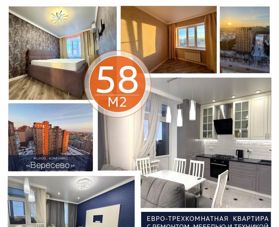 успейте купить выгодно самая лучшая планировка в жк вересаевопродаю уютную евро3хкомнатную квартиру в экорайоне вересаево.общая площадь 58 кв.м, жилая 32 кв.м. планировка квартиры включает в себяпросторная кухнястоловая 21 кв.м с выходом на лоджиюдве изолированные комнаты 15 кв.м и 17 кв.мсовременный сан узел с просторной душевой и унитазом с инсталляцией.большая прихожая с вместительными шкафамиважно вся мебель и техника остается.квартира в отличном состоянии, сделан качественный ремонт с использованием дорогих материалов. квартира готова к сделке как физически, так и юридически. полная стоимость в договоре без обременений.дом расположен в тихом, зеленом районе с развитой инфраструктурой. рядом детский сад, школа, магазины, остановки общественного транспорта. на территории жк вересаево расположены детский сад, школа, магазиныцветочный, овощной, мясной и т.д., кондитерские, спортивные площадки, детские площадки, прогулочные зоны, универмаг, рестораны, аптеки, стоматология, все виды маркетплейсов. квартира находится в экологически чистом районе возле александровской рощи, с хорошо развитой инфраструктурой и удобным транспортным сообщением с жилыми районами города.вас заинтересовала квартира звоните скорее имеется ее видеообзор, звоните, и пришлю его для васпоказ в любое удобное вам времяпросьба предупредить за сутки, буду очень признательна.добавьте это объявление в избранное, чтобы не потерять. звоните прямо сейчас, с уважением полина.