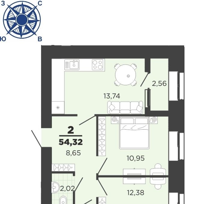 2 комн. квартира в жк юный, площадь 54.32 м², жилая 23.33 м², кухня 13.74 м²