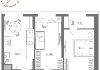 2 комн. квартира в жк северный, площадь 46.69 м², жилая 18.96 м², кухня 15.45 м²