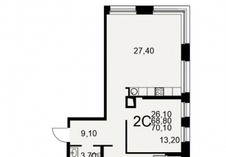 2 комн. квартира в жк акцент, площадь 70.1 м², жилая 26.1 м², кухня 27.4 м²