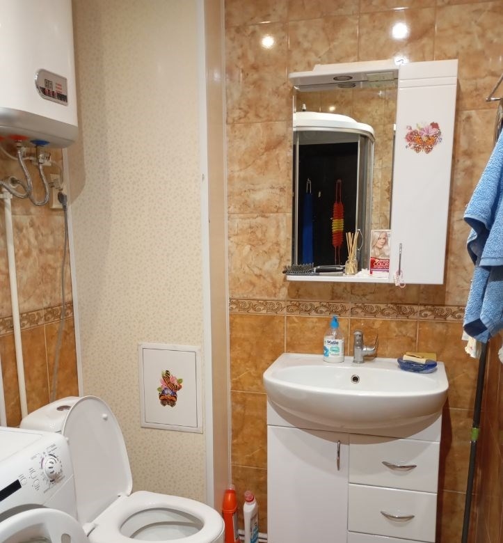 продам 1 комн. квартиру . общая площадь 41 м, комната 16.8 м., кухня 12,4 м. две лоджии 8,4 м ремонт был капитальный бетонная стяжка пола, замена радиаторов и стояков, новая жл. проводка, водоснабжение. стеклопакеты везде, на лоджия тоже оконные блоки. ремонту 10 лет. косметика в хорошем состоянии. можно спокойно жить. мебель оставляем всю, кроме холодильника и диванчика на кухне. по документам 1 взрослый собственник. долгов нет.