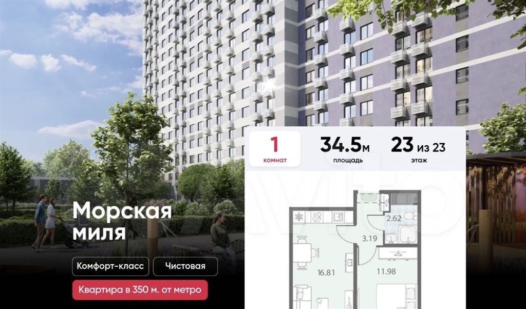цена действует при 100 оплате и на определенные ипотечные программы.подробности по телефону.продается 1комнатная квартира в жк морская миля на 23 этаже. общая площадь составляет 34.50 кв. м. квартира с чистовой отделкой. жилой комплекс морская миля располагается по адресу санктпетербург, красносельский.морская миля жилой комплекс в красносельском районе санктпетербурга. расположение комплекса его главное преимущество близость к таким историческим памятникам и местам, как петергоф, павловский дворец и царское село позволяет в любой момент насладиться красотами культурной столицы россии. расположение всего 350 м до новой станции метро югозападная 20 минут до петергофа на автомобиле 20 минут до аэропорта пулково на автомобиле 30 минут до царского села на автомобиле.между корпусами расположены спортивные и детские площадки, пешеходный бульвар. в квартире выполнена полная отделка comfort wood из качественных материалов прочный ламинат цвета благородного дуба, фактурные белые обои, керамическая плитка в ванной.вход в парадные расположен на уровне земли и создает доступную среду для пожилых людей, людей с ограниченными возможностями и мам с колясками. на этажах и в подвале есть кладовые, которые позволят освободить пространство квартиры от лишних вещей. первые этажи отведены под магазины и колясочные.на территории комплекса находятся наземные паркинги, гостевые парковки, детский сад, школа. в пешей доступности расположены магазины, кафе, аптеки и прочие удобства, необходимые для спокойной и комфортной жизни. во дворах устроены пешеходные зоны, дворы озеленены и благоустроены имеются тенистые аллеи, уютные зоны для отдыха детей и взрослых, а также стильные плейхабы. преимущества станция метро в пешей доступности пешеходный бульвар близость к памятникам культуры и архитектуры школа и детский сад во дворе доступная средауспейте приобрести квартиру на выгодных условиях