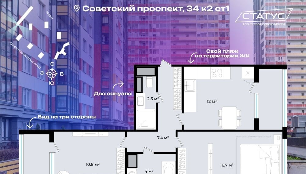 просторная 2комнатная квартира с видом на три стороны в жк невские парусаудобная двухкомнатная квартира площадью 53,2 м² 2 лоджии с окнами на три стороны света. просторная кухнягостиная 12 м², две изолированные комнаты 16,7 м² и 10,8 м² идеальный формат для семьи. в квартире два санузла, функциональная прихожая и вместительные ниши для хранения. планировка отлично подойдёт как для жизни, так и для сдачи в аренду.советский проспект, 34 к2 удобный выезд на зсд и до центра города 1520 минут на авто. экологически благоприятный район с набережной и зелёными зонами рядом.на территории жк есть всё необходимое частный пляж, магазины, кафе, спортивные и детские площадки. закрытая охраняемая территория, подземный паркинг и развитая социальная инфраструктура.отличный выбор для семьи с детьми, молодых пар или инвесторов формат востребован для долгосрочной аренды благодаря локации и инфраструктуре.оставьте заявку, чтобы узнать цену, рассчитать ипотеку и записаться на просмотр