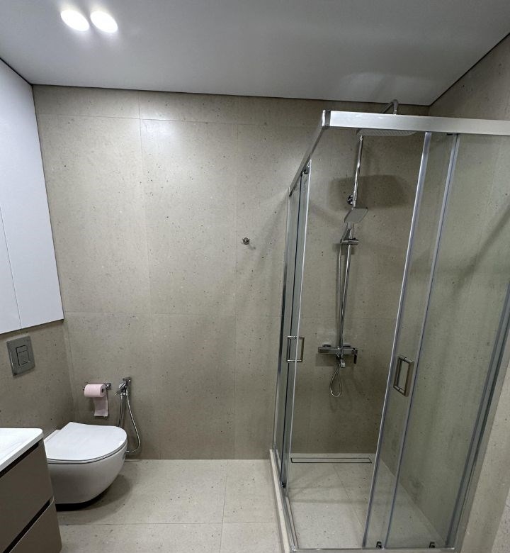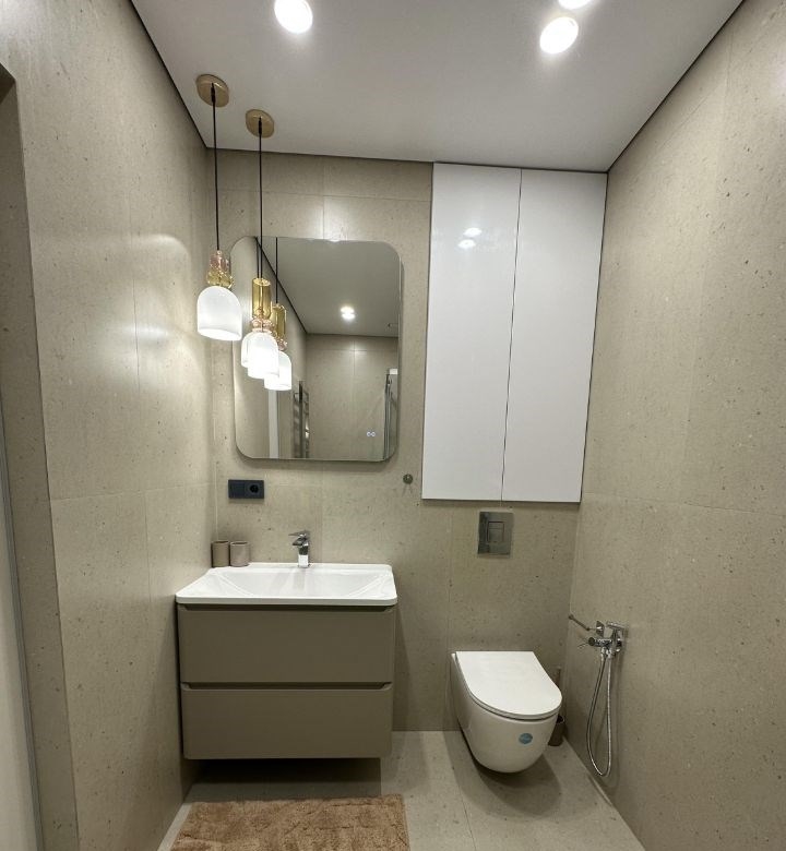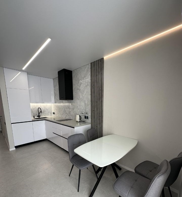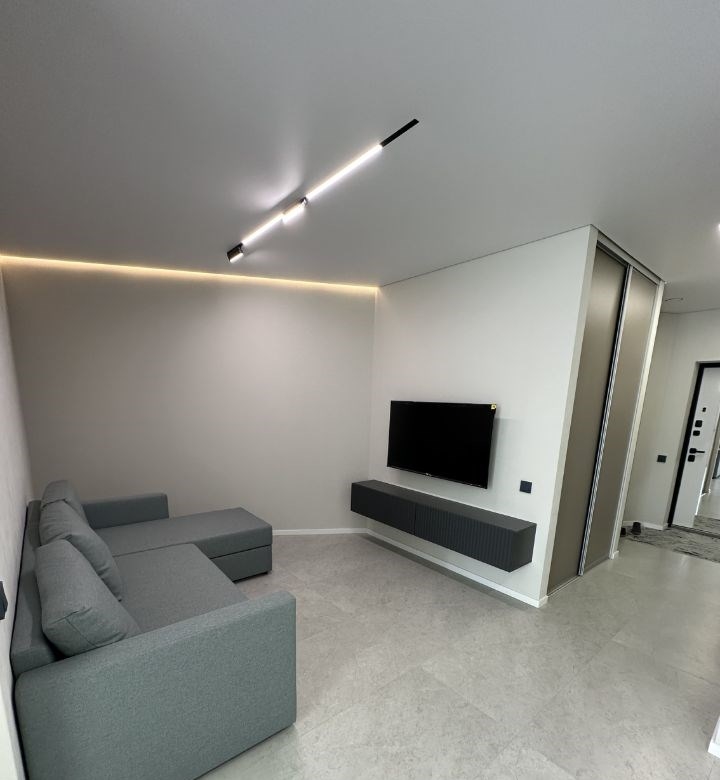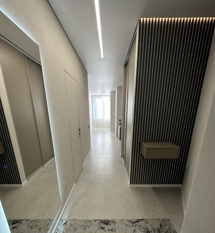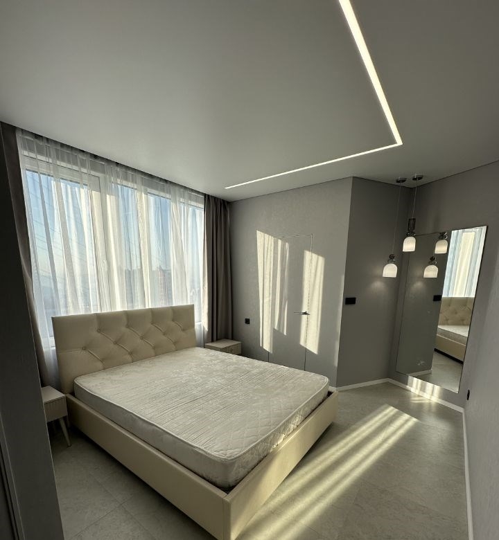 сдам квартиру в центрегардеробная, новая входная дверь, на полу керамогранит, межкомнатные двери скрытого монтажа ,натяжной потолок с сафитами с световыми линиями и с теневой подсветкой ,, стены выровнены, во всех комнатах тёплый пол.