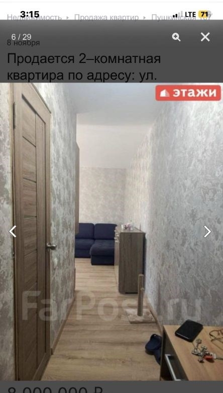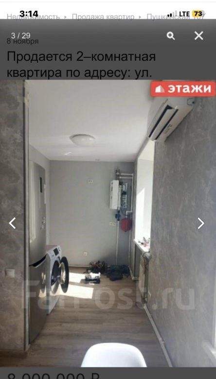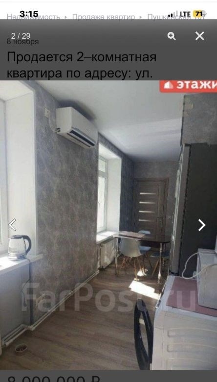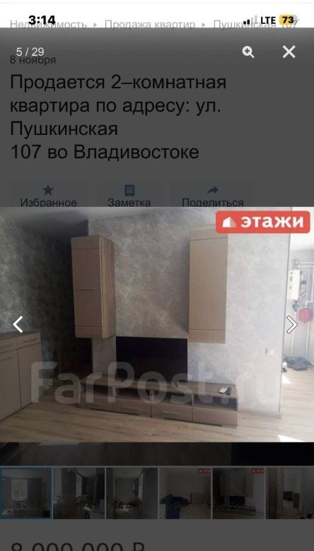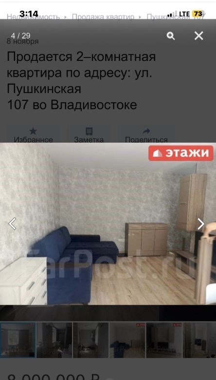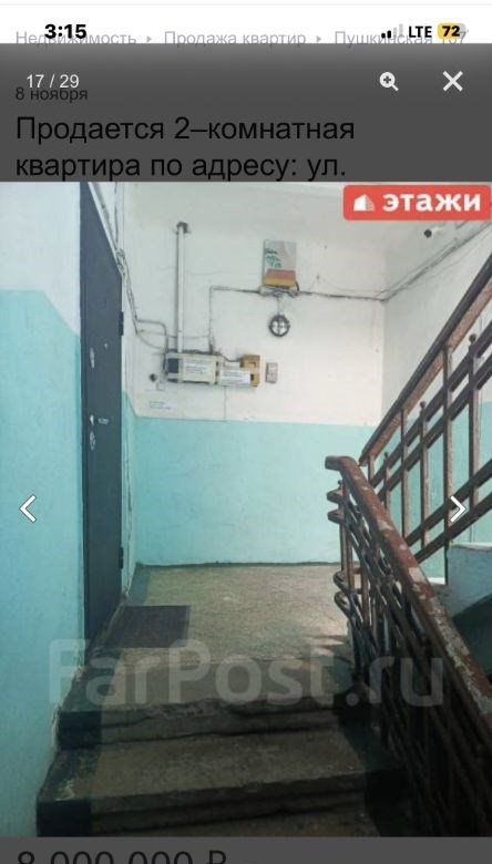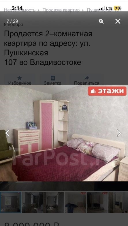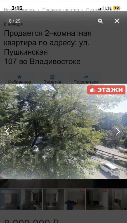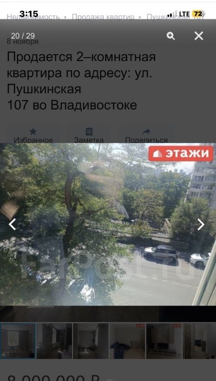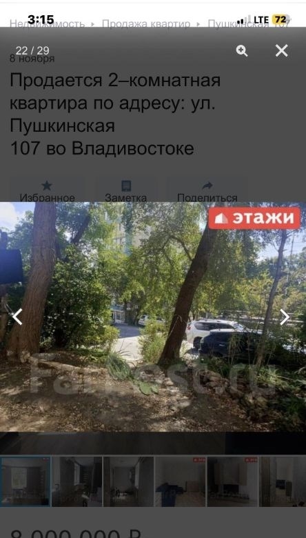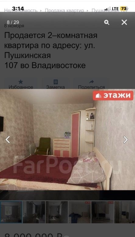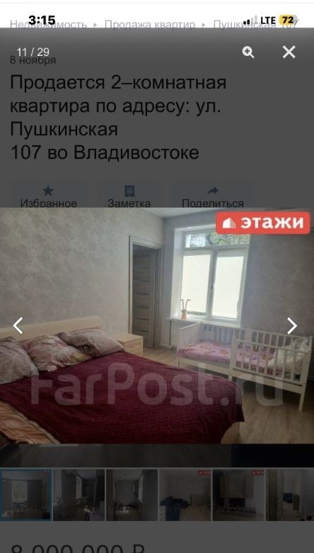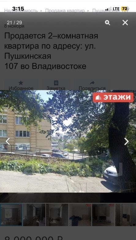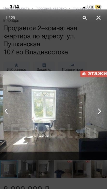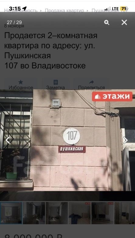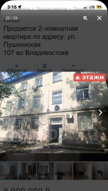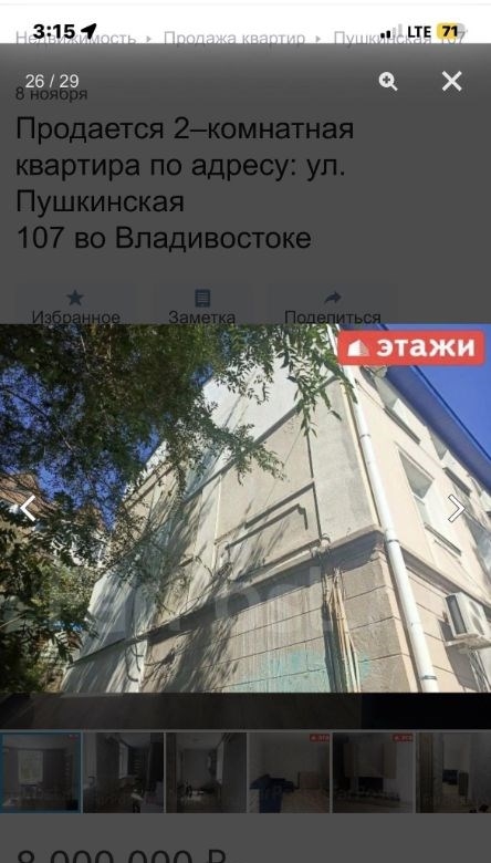 компания этаживладивосток предлагает к продаже 2х комнатную квартиру по адресу пушкинская 107двухкомнатная квартира площадью 43,7 кв. м расположена на третьем этаже кирпичного трехэтажного дома на улице пушкинской, 107.объект отличается высоким качеством строительства толстые стены обеспечивают комфортный микроклимат, сохраняя прохладу летом и тепло зимой широкие подоконники подчеркивают надежность конструкции. ключевым преимуществом является вид из окон на бухту золотой рог и городскую акваторию. планировка функциональна и включает длинный коридор, с местом для гардероба, изолированную спальню и светлую кухнюгостиную, что создает условия для приватности и совместного времяпрепровождения. отопление от собственного котла, можно включать и выключать когда захочешь, регулировать температуру. котел новый, если добавить модуль может работать от телефона. горячая вода от бойлера. всегда можно найти парковочное место во дворе дома.мебель и бытовая техникамебель по договоренности.инфраструктура и коммуникациидом находится в одном из самых престижных и тихих районов города, в шаговой доступности от набережной цесаревича и нагорного парка. при отсутствии шума центральных улиц локация обеспечивает отличную транспортную доступность до делового центра владивостока можно добраться за три минуты на автомобиле. инфраструктура развита в непосредственной близости расположены две общеобразовательные школы, двгту, спортивный комплекс, цирк и сквер комсомольцев.дополнительные услугимы компания этажи во владивостоке. проконсультируем вас по ипотечным программам в пао сбербанк и пао втб, ао банк дом. рф и в любых других банках. поможем оформить заявку на сайте банка онлайн у нас в офисе. проконсультируем для получения ипотеки с наибольшей вероятностью одобрения.